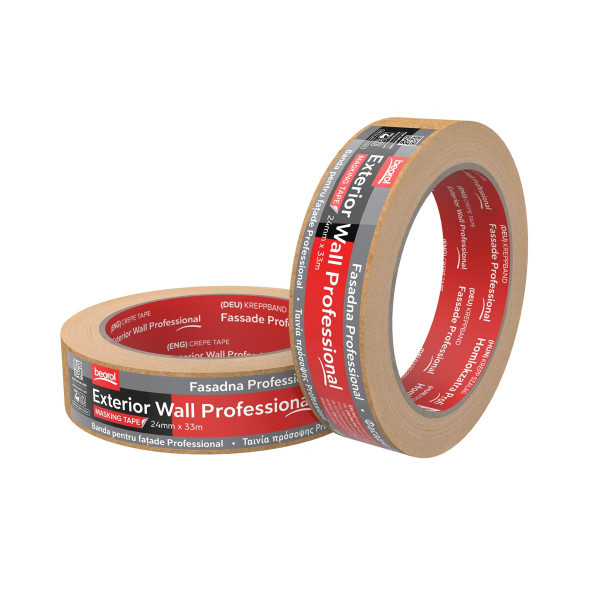 Krep traka Fasadna Professional 24mm x 33m je namenjena za zaštitu spoljašnjih površina prilikom izvođenja fasadnih radova. Traku karakteriše lepak od prirodnog kaučuka. Namenjena je profesionalnim i poluprofesionalnim fasaderima. Nakon lepljenja na površinu, pruža najbolje performanse do 72h i ostavlja površinu čistom nakon uklanjanja trake. Zahvaljujući odličnoj otpornosti na temperaturne i atmosferske uticaje, ova traka je najbolja za spoljašnju upotrebu. Pogodna je za lepljenje na ravnim i neravnim površinama i prilikom odlepljivanja se ne kida niti ostavlja trag lepka/trake na tretiranoj površini. Preporuka je da se koristi na površinama kao što su spoljni zidovi. Boja: Braon.