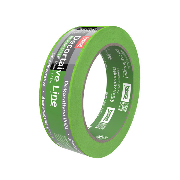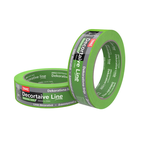 Krep traka Deco line 30mm x 33m je namenjena za zaštitu površina različitih oblika, kao i molerske radove koji zahtevaju izradu različitih oblika i kombinovanje tehnika. Traku karakteriše lepak od prirodnog kaučuka i elastični papir. Kombinacija papira i lepka na ovoj traci onemogućava probijanje boje na zalepljenu površinu prilikom izvođenja radova. Namenjena je profesionalnim i poluprofesionalnim molerima kao i hobistima. Nakon lepljenja na površinu, traka pruža najbolje performase do 48h i ostavlja površinu čistom nakon uklanjanja trake. Boja: Zelena.