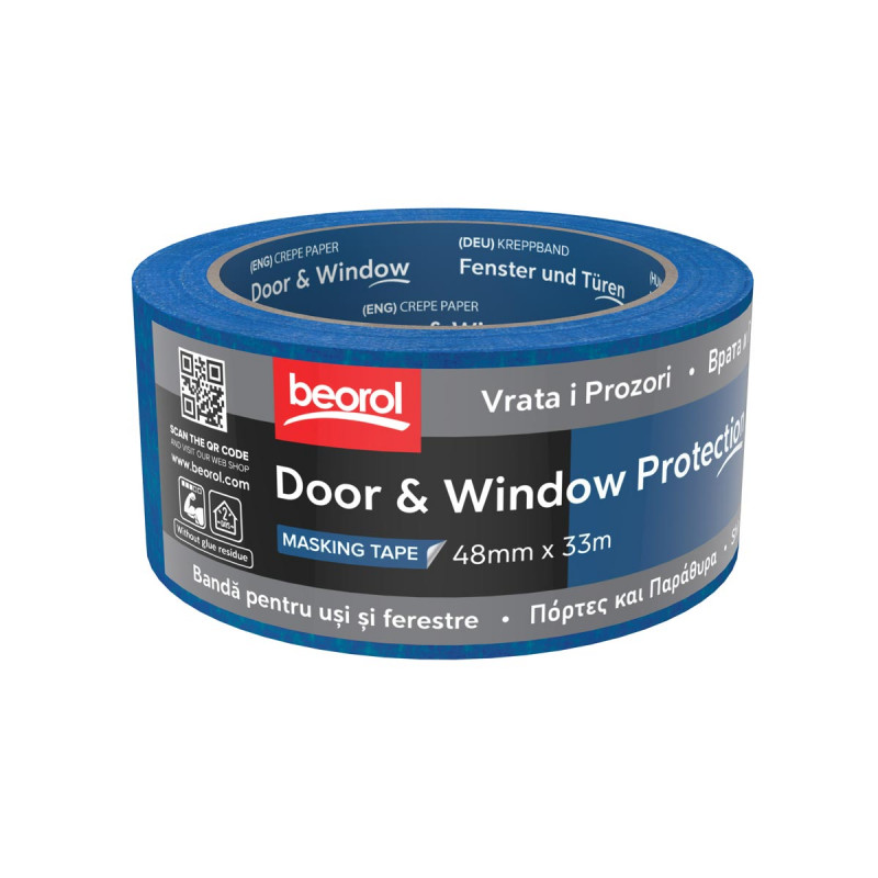 Krep traka za zaštitu vrata i prozora 48mm x 33m je namenjena zaštiti stolarije, kao što su vrata i prozori. Traku karakteriše lepak od prirodnog kaučuka. Namenjena je profesionalnim i poluprofesionalnim molerima kao i hobistima. Nakon lepljenja na površinu, traka pruža najbolje performanse do 48h i ostavlja čistu površinu nakon uklanjanja. Zahvaljujući elastičnosti papira, obezbeđuje pokrivanje nepristupačnih delova stolarije. Prilikom odlepljivanja sa tretirane površine, ne ostavlja lepak kao ni delove trake na površini što je čini najboljim izborom za zaštitu stolarije prilikom izvođenja molerskih i drugih radova u objektu. Preporuka je da se koristi za stolariju različitog materijala kao što su PVC, drvo i aluminium. Traka nije UV otporna pa se ne može koristiti na spoljnim površinama. Maksimalna dužina stajanja 3 dana. Boja: Plava.