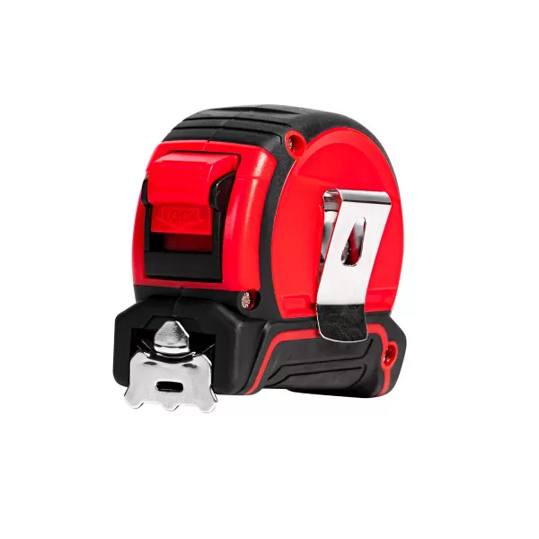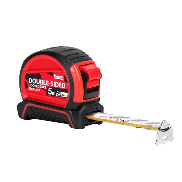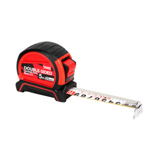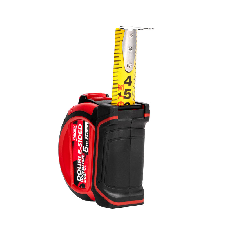 Opremljen dvostranom mernom trakom dužine 5m i širine 25mm, omogućava precizno merenje u različitim uslovima, pri čemu traka može da ostane uspravno razvijena do 2,2m bez savijanja. Izrađena je od visokoelastičnog čelika i obložena PVC zaštitnom folijom, što je čini izdržljivom i otpornom na habanje.