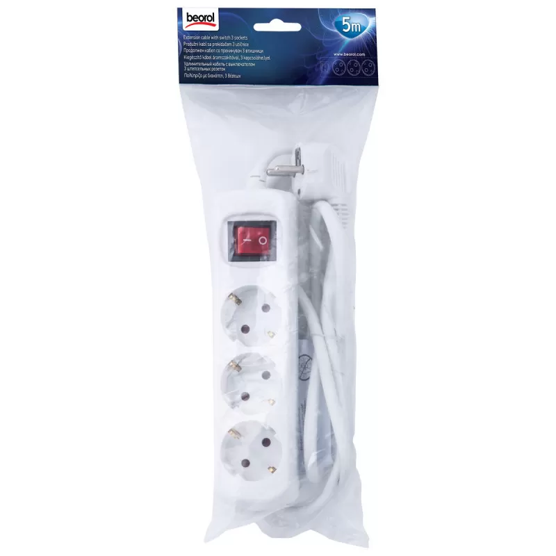 Produžni kabl sa prekidačem 3 utičnice, 5m je savitljiv kabl namenjen za dovod struje do električnih aparata u zatvorenim prostorijama. Ovaj model poseduje tri utičnice, omogućavajući povezivanje više uređaja istovremeno. Dužina kabla od 5 metara pruža dovoljnu fleksibilnost za različite situacije, a H05VV-F preseka 3x1.5mm2 garantuje siguran prenos energije.