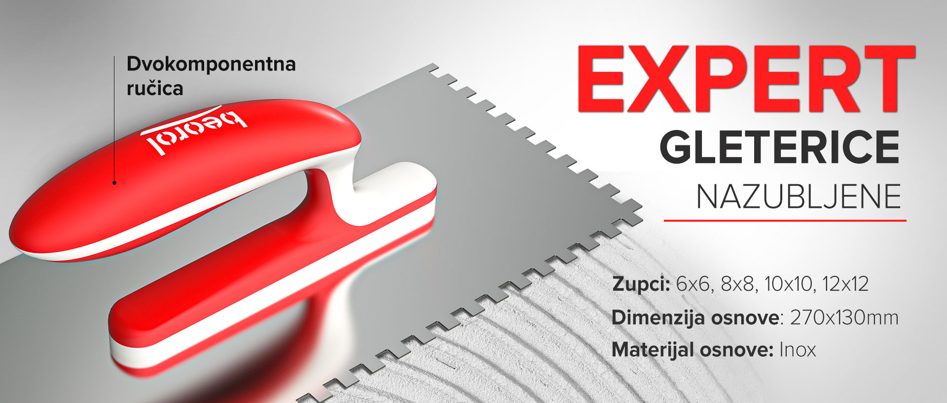 Gleterica Expert nazubljena namenjena je za precizno nanošenje građevinskih lepkova, gde je ravnomerna distribucija materijala ključna za dobar rezultat. Izrađena je od nerđajućeg čelika debljine 0,7 mm, što obezbeđuje stabilnost i pouzdanu kontrolu tokom rada. Radna osnova dimenzija 270 × 130 mm pruža optimalnu površinu za profesionalnu primenu, dok dvokomponentna drška od polipropilena ojačanog fiberglasom i TPE gumom omogućava siguran i udoban hvat.