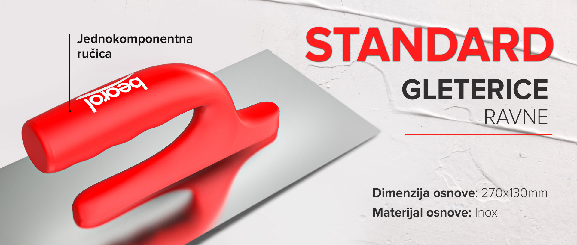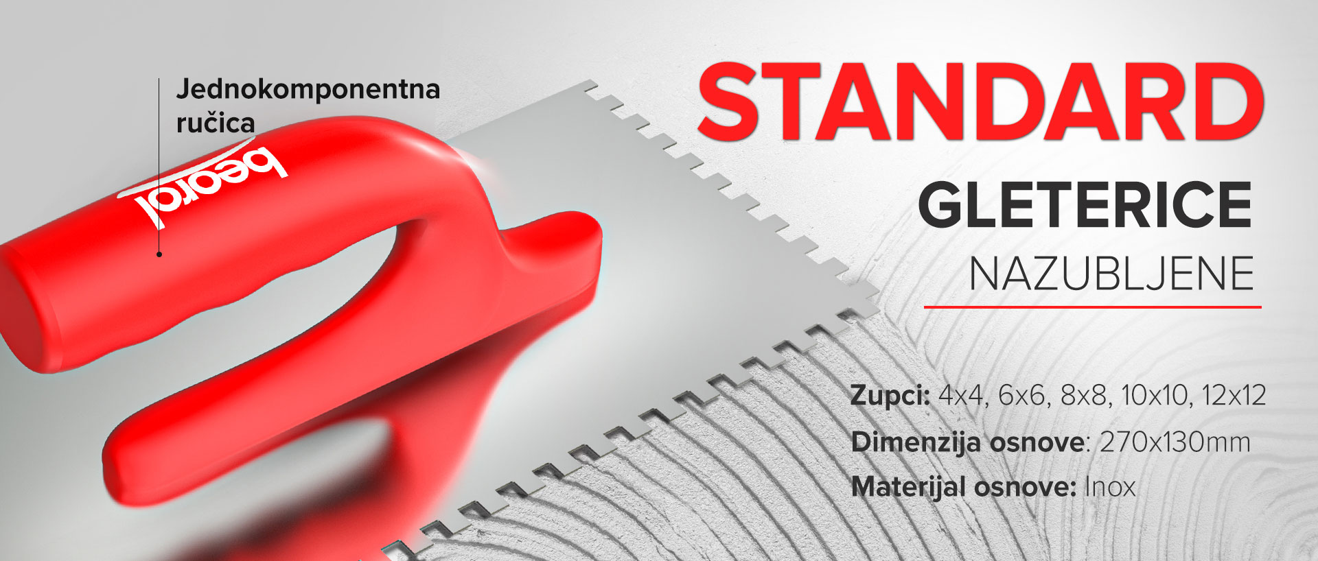 Gleterica Standard nazubljena namenjena je za nanošenje građevinskih lepkova i drugih materijala kod kojih je potrebno ravnomerno raspoređivanje i formiranje ujednačenih žlebova. Osnova od nerđajućeg čelika debljine 0,7 mm obezbeđuje stabilnost i preciznost tokom rada, dok dimenzije 270 × 130 mm omogućavaju efikasno pokrivanje radne površine. Dostupna je sa više dimenzija zubaca – 4x4 mm, 6x6 mm, 8x8 mm i 10x10 mm, što omogućava izbor odgovarajuće varijante u zavisnosti od vrste materijala i načina aplikacije. Jednokomponentna PVC drška pruža pouzdan i udoban hvat u svim uslovima rada.